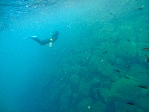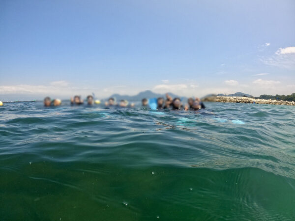 シュノーケル実習では、北限のサンゴを実際に観察することができました。サンゴが生息している周りの環境は非常に多様性があり、多くの生き物が共生している様子を確認することができました。今年度は新たな取組として、養殖いけすの見学も行い、アジの養殖の現場では近年水温が高くなりすぎて、養殖が難しい環境であることを知りました。地球温暖化が生態系に少しずつ影響を与えており、生徒たちは今後の地球の環境について考察するよい機会になりました。