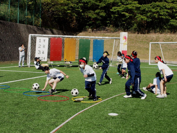 競技はダイナミックな回転が見ごたえのある「台風の目」、バットを軸に回転する「まわってGO!」と続いていきます。「障害物競走」では、サッカーボールをラケットで運んだり、袋にはいって元気に跳びながら進んだりと、皆、笑顔で楽しみながら競技に参加していました。和邇(ワニ)を並ばせてその背中を歩いて海を渡ったという「因幡の白ウサギ」の神話にちなんだ種目では、四つん這いになったチームメイトの背中を素早く渡ってゴールを競いました。「玉入れ」に続いて、後の走者になるほど走る距離が伸びる「スウェーデンリレー」で、午前中の種目を終了しました。