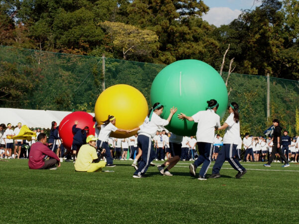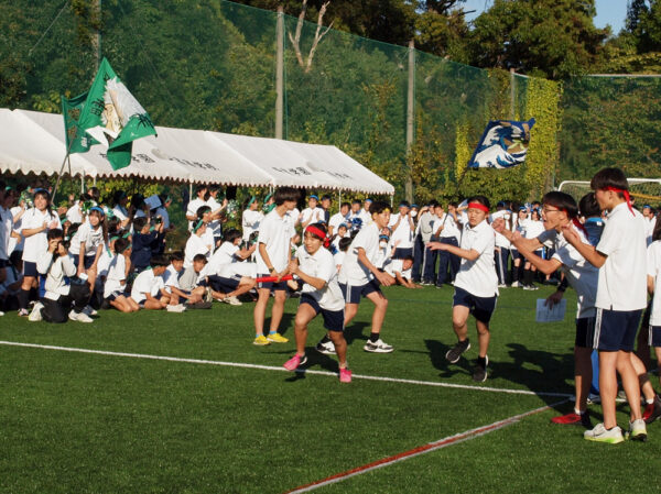 競技は1年生の「大玉運び」、クラス全員で協力する2年生の「大縄跳び」、迫力のある3年生の「騎馬戦」と続きます。全学年が行う「綱引き」では、傍らで応援する教員と生徒たちの声援にも熱がはいり、各チームが一丸となって全力を出しました。最後の種目は「色別対抗リレー」です。各クラスの代表メンバーが、会場の保護者の皆様と生徒たちの大きな声援のなか、バトンをつなぎ、走り切りました。