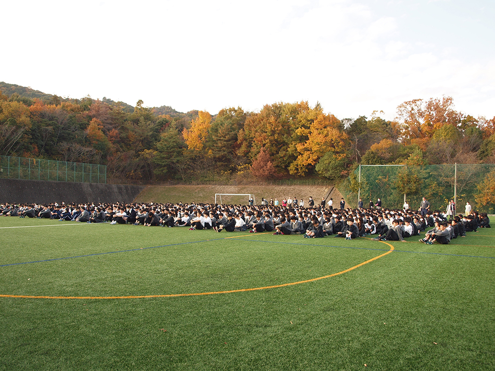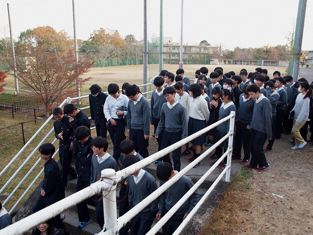 避難場所である総合グラウンドへ向かう際には、生徒たちは周囲の安全に十分配慮しながら、走らず、しかし迅速に行動し、真剣な面持ちで避難を行いました。到着後は各クラスごとに整列して点呼を行い、学年主任から「何組何人中何名避難完了」という報告が順に入り、最終的に校長へ伝達されました。緊急放送から避難完了までに要した時間は12分で、落ち着いたスムーズな避難が達成されました。