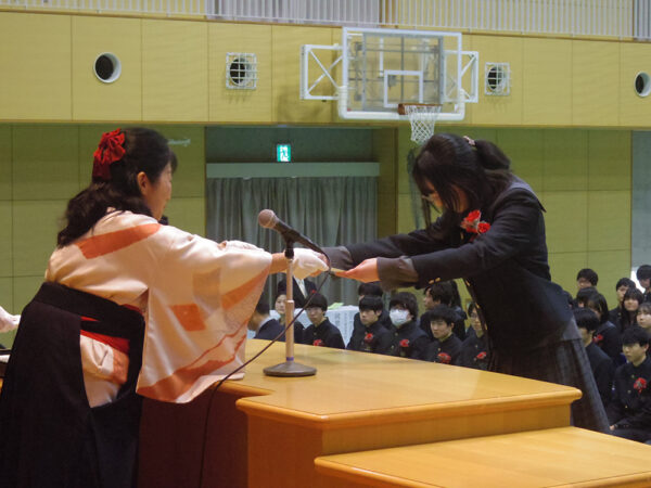 卒業証書授与に続いて、高校3年間の皆勤者に皆勤賞、文系・理系・医進コースの成績優秀者に至誠力行賞、理数コースの成績優秀者に日本私立中学高等学校連合会会長賞を授与しました。