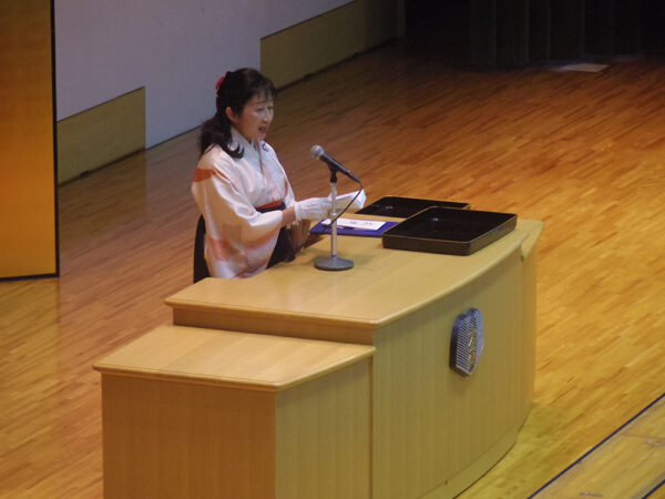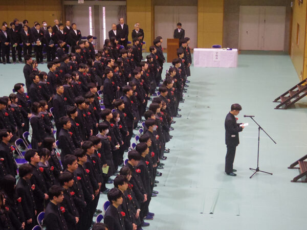 来賓と在校生代表の送辞に続いて、卒業生代表が答辞を述べました。第45期卒業生は、中学1年生で新型コロナウイルスの影響を受け、高校2年生の文化祭で5年ぶりの食品模擬店に取り組んだ世代です。6年間を振り返り、先生や保護者、ともに活動に取り組んだ友人への感謝を伝え、「将来、奈良学園で培った学びと経験、そして人との繋がりが必ず私たちを支えてくれると信じています」と力強く語りました。