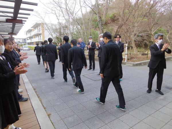 閉会し、卒業生らがいよいよ退場という場面で、「ちょっと待ったー!」と声が上がりました。卒業生たちからのサプライズです。担任や各科目の先生にお礼の言葉を伝えて花束を贈り、保護者の方を向いて感謝の気持ちを伝えました。その後、卒業生たちは教員や在校生の温かい拍手に見送られ、胸を張って巣立っていきました。