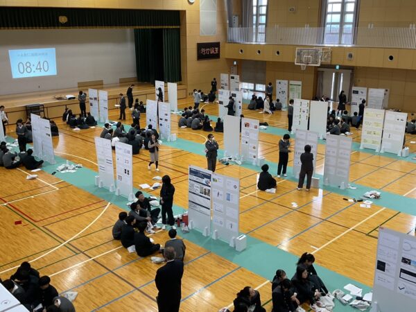 発表会では、これまでの研究成果をポスターまたはパワーポイントのスライド形式にまとめ、その資料をボードに張り出したものを準備しました。そして、4人ずつを1グループとし、それぞれが張り出した資料を基にして、順番に発表する形式をとりました。発表者は他の中学3年生だけでなく、聴衆として参加している中学2年生および教員に対して自らの研究成果を説明し、終了後には聴衆からの質問に対して丁寧に回答していました。各所で見られる堂々とした発表、真剣な質疑応答、それに発表終了後に起こる大きな拍手。会場となった体育館は学会さながらの雰囲気でした。
