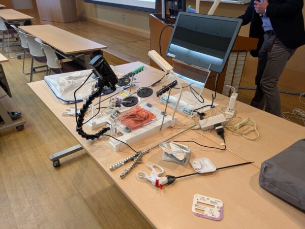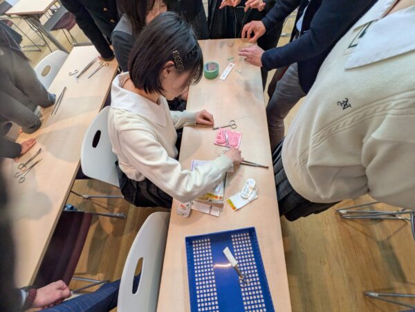 最後に現在の外科医不足のお話もされて、是非外科医を目指して欲しいという激励のお言葉もいただきました。現場の話をお聞きすることで、今まで漠然とイメージしていた医師の仕事を、具体的に感じられるきっかけとなりました。さらに講演が終わった後、希望者対象に研修医が使う内視鏡下手術の練習用機器も使わせていただいたり、医療用の衣服を着用させていただいたりしました。生徒は機器の扱いに悪戦苦闘しながら何度も挑戦し、その場でも先生との間で活発なやり取りがあり、生徒のモチベーションが大きく上がる講座となりました。