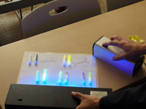 講義の最後には、伊藤先生が持参された光る分子を実際に観察する機会もあり、生徒たちは興味津々の様子で、さらに多くの質問を投げかけていました。化学への好奇心を刺激する、充実した講座となりました。